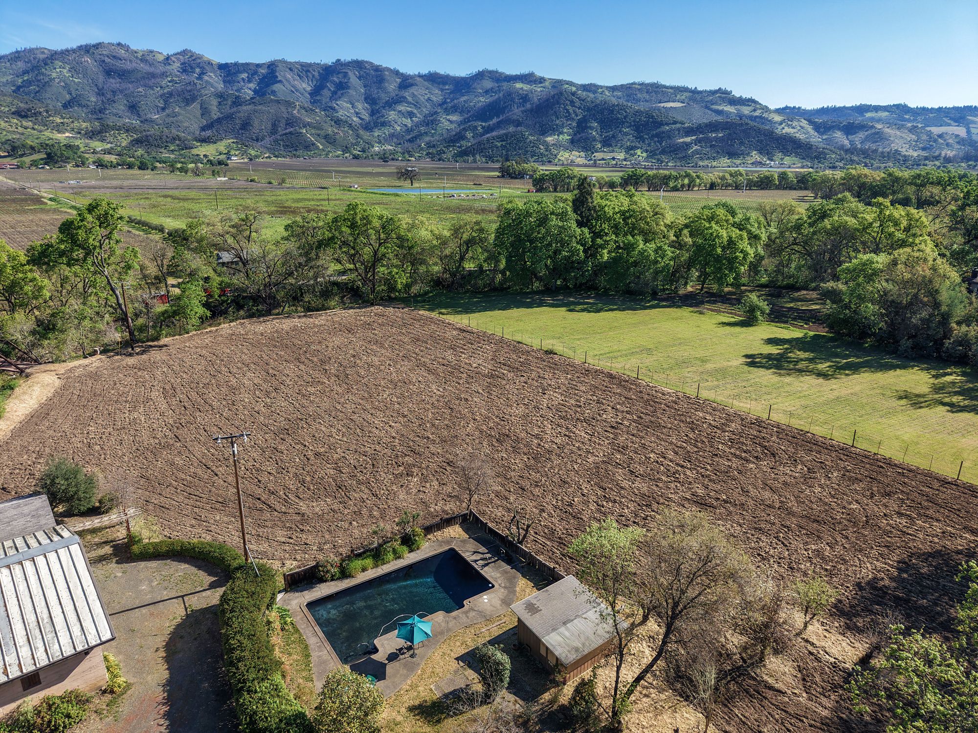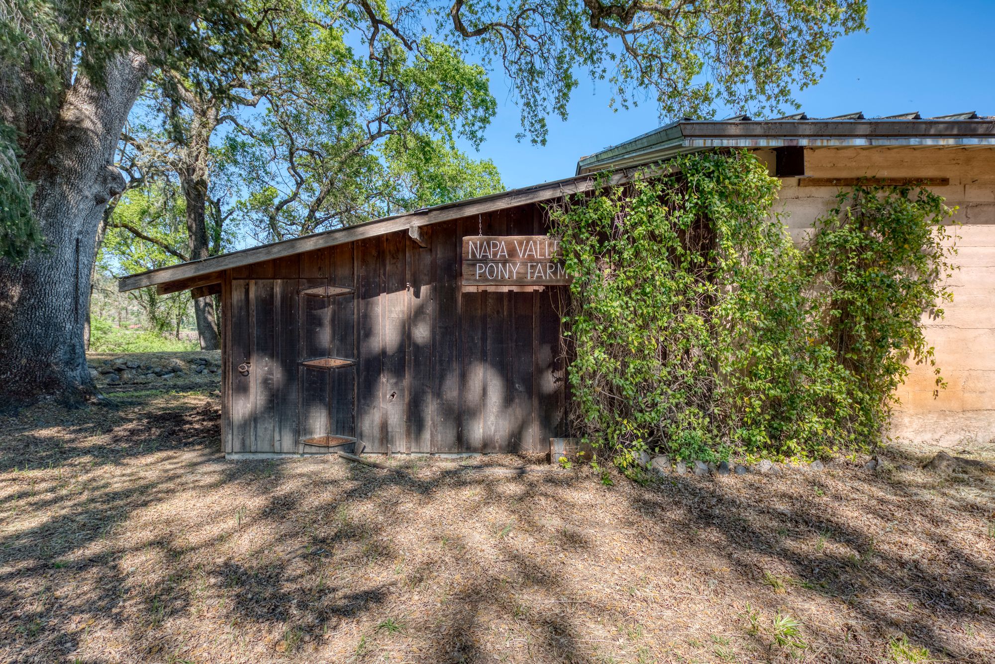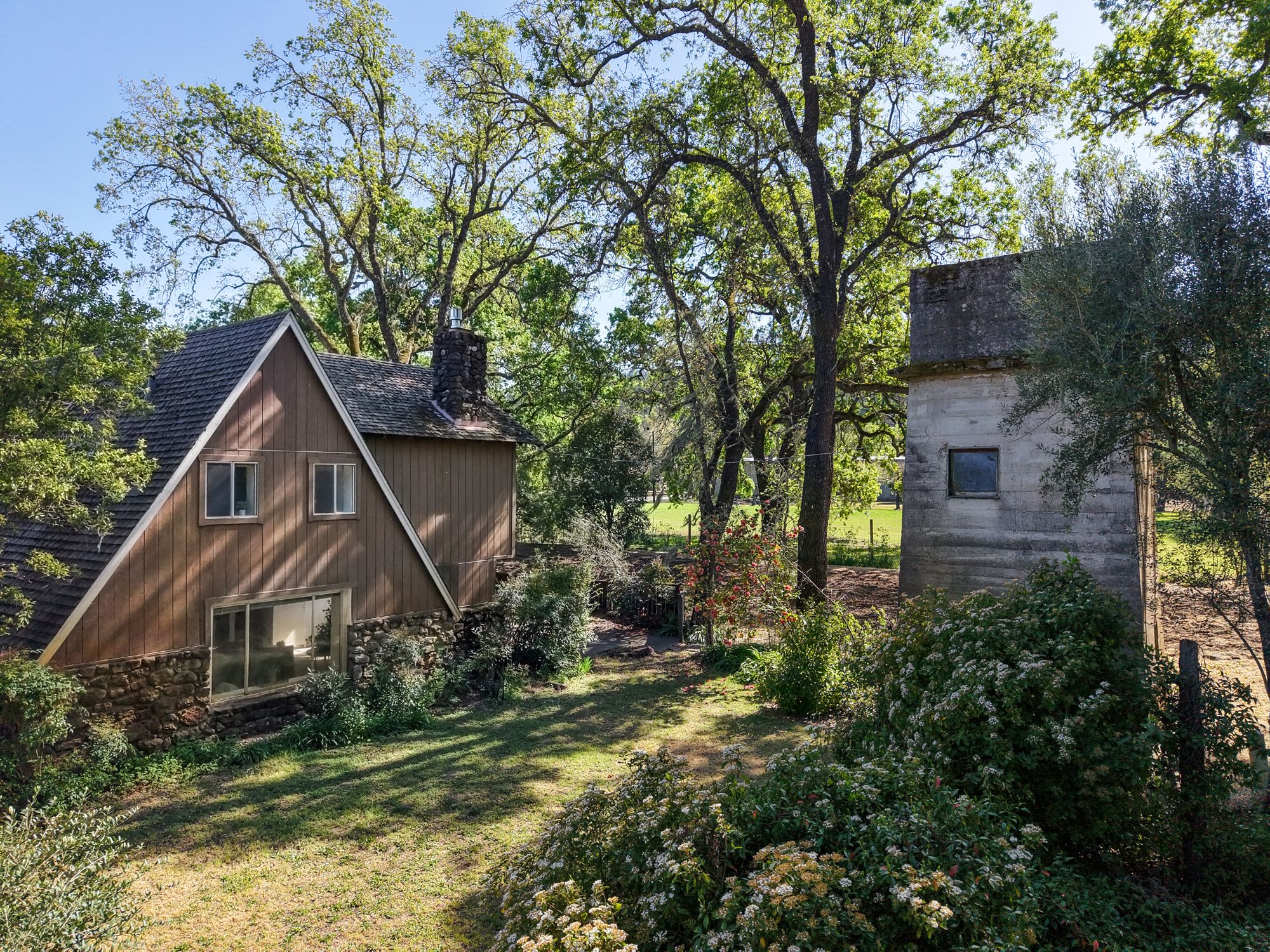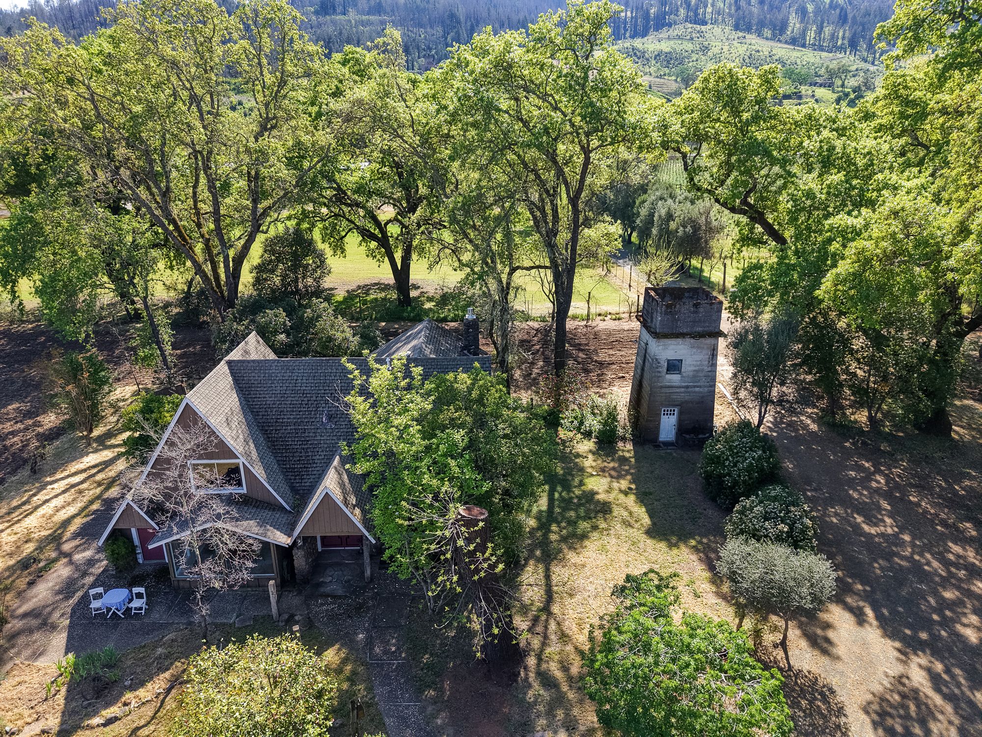 A tree-lined driveway reveals a setting that feels removed from the pace of everyday life. Upon arrival, the historic concrete water tower stands as a striking architectural landmark, its second-story hideaway offering a distinctive and unexpected introduction to the property. The main residence rests beneath a canopy of mature trees, with natural light and surrounding views shaping each space. There is a sense of opportunity here with an invitation to restore, refine, or completely reimagine the home while honoring its character and setting. Nearby, a modest potting shed and the pool area reflect the rhythm of country living and years of stewardship. The grounds open to one of the property’s most compelling features: a concrete-walled barn, originally built in 1922. Long regarded as a former “ghost winery,” the structure carries a presence that is both storied and substantial. Along the rear, horse stalls and a tack room speak to the property’s equestrian roots. Set apart is the “bunkhouse,” a charming ADU relocated from Bothe State Park, rich with its own history and ready to be reimagined for guests, extended family, or creative use. Bordering the Napa River, the land is fertile and alive. Offering space for gardens, animals, and a deeper connection to the landscape. Wildlife moves freely, and a quiet stillness defines the setting, creating a sense of privacy that feels increasingly rare. Spanning approximately 7.85 acres and held in the same family for over 60 years, this is an opportunity to shape a legacy property in one of Napa Valley’s most coveted locations, just minutes from Calistoga and St. Helena
