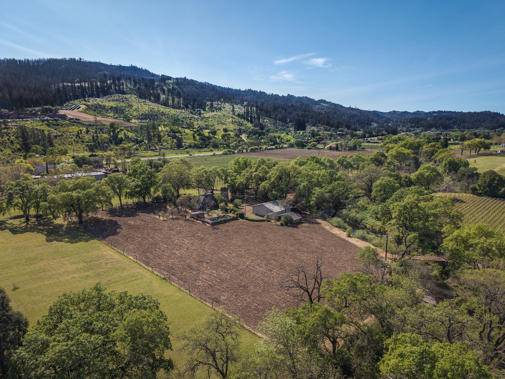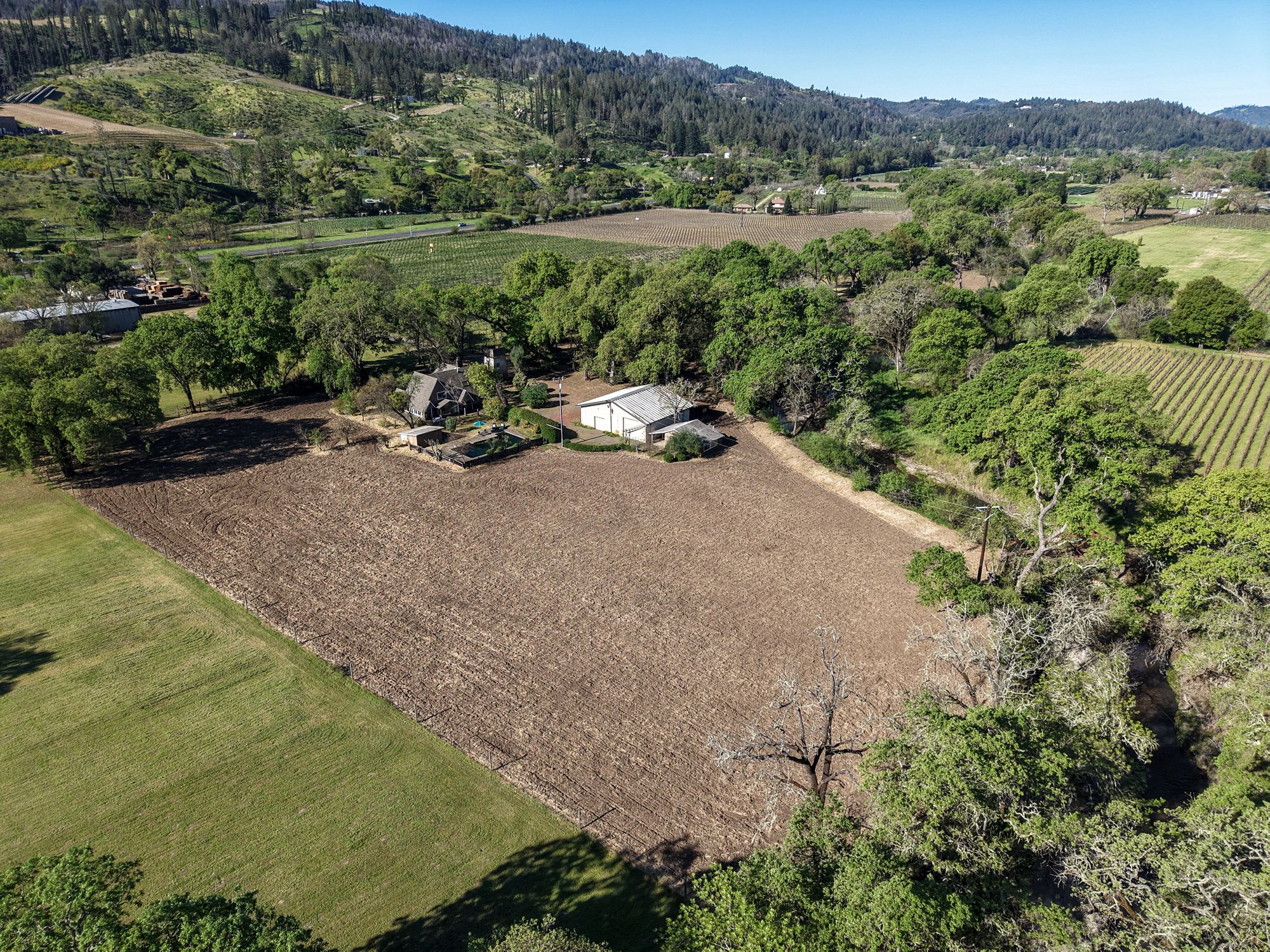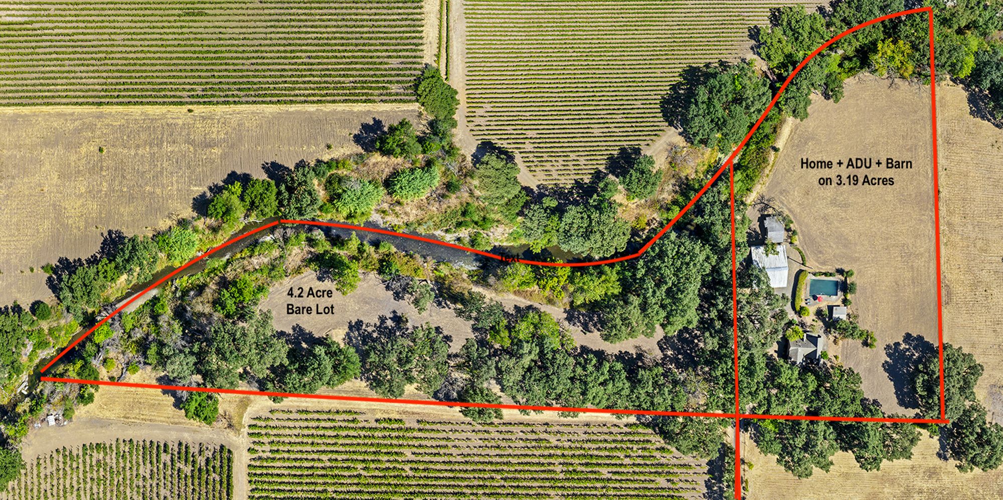 A tree-lined driveway reveals a setting that feels removed from the pace of everyday life. Upon arrival, the historic concrete water tower stands as a striking architectural landmark, its second-story hideaway offering a distinctive and unexpected introduction to the property. The main residence rests beneath a canopy of mature trees, with natural light and surrounding views shaping each space. There is a sense of opportunity here with an invitation to restore, refine, or completely reimagine the home while honoring its character and setting. Nearby, a modest potting shed and the pool area reflect the rhythm of country living and years of stewardship. The grounds open to one of the property’s most compelling features: a concrete-walled barn, originally built in 1922. Long regarded as a former “ghost winery,” the structure carries a presence that is both storied and substantial. Along the rear, horse stalls and a tack room speak to the property’s equestrian roots. Set apart is the “bunkhouse,” a charming ADU relocated from Bothe State Park, rich with its own history and ready to be reimagined for guests, extended family, or creative use. Bordering the Napa River, the land is fertile and alive. Offering space for gardens, animals, and a deeper connection to the landscape. Wildlife moves freely, and a quiet stillness defines the setting, creating a sense of privacy that feels increasingly rare. Spanning approximately 7.85 acres and held in the same family for over 60 years, this is an opportunity to shape a legacy property in one of Napa Valley’s most coveted locations, just minutes from Calistoga and St. Helena