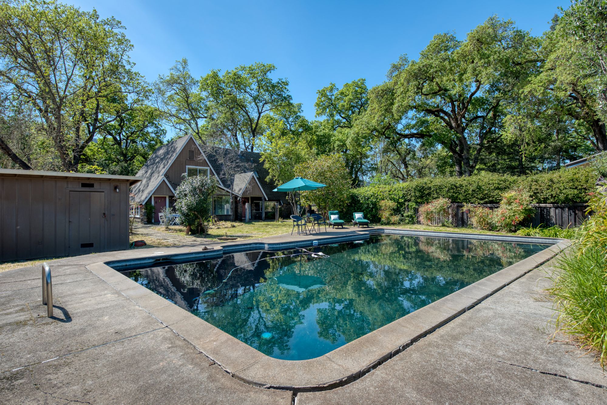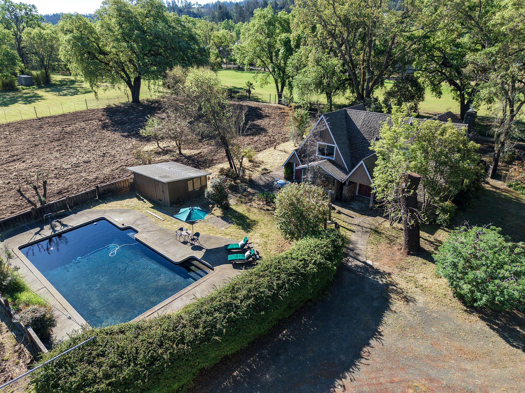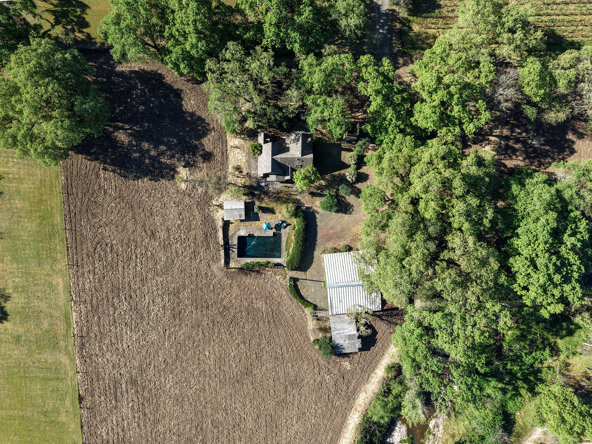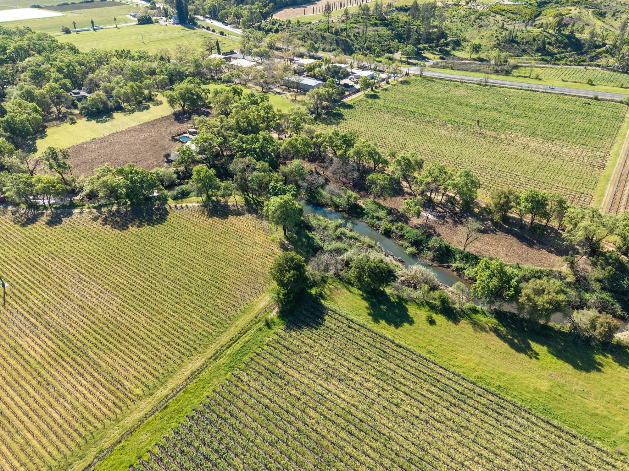 A tree-lined driveway reveals a setting that feels removed from the pace of everyday life. Upon arrival, the historic concrete water tower stands as a striking architectural landmark, its second-story hideaway offering a distinctive and unexpected introduction to the property. The main residence rests beneath a canopy of mature trees, with natural light and surrounding views shaping each space. There is a sense of opportunity here with an invitation to restore, refine, or completely reimagine the home while honoring its character and setting. Nearby, a modest potting shed and the pool area reflect the rhythm of country living and years of stewardship. The grounds open to one of the property’s most compelling features: a concrete-walled barn, originally built in 1922. Long regarded as a former “ghost winery,” the structure carries a presence that is both storied and substantial. Along the rear, horse stalls and a tack room speak to the property’s equestrian roots. Set apart is the “bunkhouse,” a charming ADU relocated from Bothe State Park, rich with its own history and ready to be reimagined for guests, extended family, or creative use. Bordering the Napa River, the land is fertile and alive. Offering space for gardens, animals, and a deeper connection to the landscape. Wildlife moves freely, and a quiet stillness defines the setting, creating a sense of privacy that feels increasingly rare. Spanning approximately 7.85 acres and held in the same family for over 60 years, this is an opportunity to shape a legacy property in one of Napa Valley’s most coveted locations, just minutes from Calistoga and St. Helena